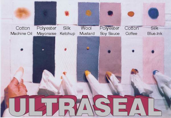 The smaller swatches in the top row are without Ultraseal, and the stains penetrated immediately. The larger fabrics are finished with Ultraseal, and two drops of stain were applied to each; the bottom drop was cleaned off with absorbent paper towel, leaving virtually no trace.